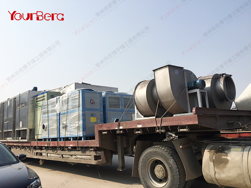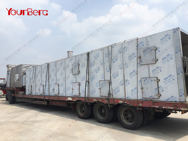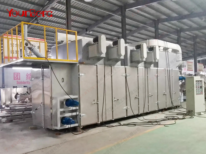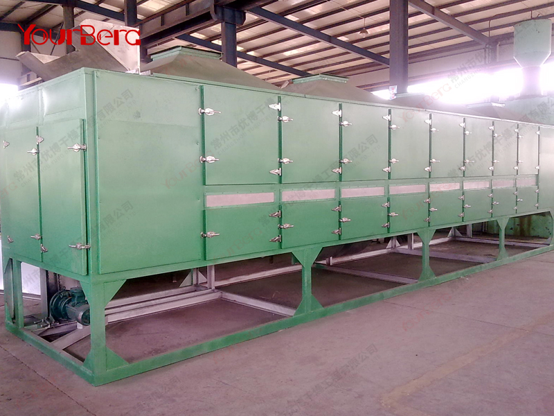 物料由加料器均勻地鋪在網(wǎng)帶上,網(wǎng)帶采用12-60目不銹鋼絲網(wǎng)。由傳動(dòng)裝置拖動(dòng)在干燥機(jī)內(nèi)移動(dòng)。干燥機(jī)由若干單元組成,每一單元熱風(fēng)獨(dú)立循環(huán),部分尾氣由專門(mén)排濕風(fēng)機(jī)排出,廢氣由調(diào)節(jié)閥控制,熱氣由下往上或由上往下穿過(guò)鋪在網(wǎng)帶上的物料,加熱干燥并帶走水分。網(wǎng)帶緩慢移動(dòng),運(yùn)行速度可根據(jù)物料溫度自由調(diào)節(jié),干燥后的成品連續(xù)落入收料器中。上下循環(huán)單元根據(jù)用戶需要可靈活配備,單元數(shù)量可根據(jù)需要選取。